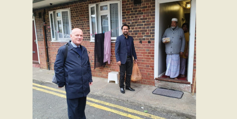 হোয়াইট চ্যাপেল ওয়ার্ডের প্রবীণদের ঘরে ইফতারি পৌঁছে দিচ্ছেন মেয়র জন বিগস।