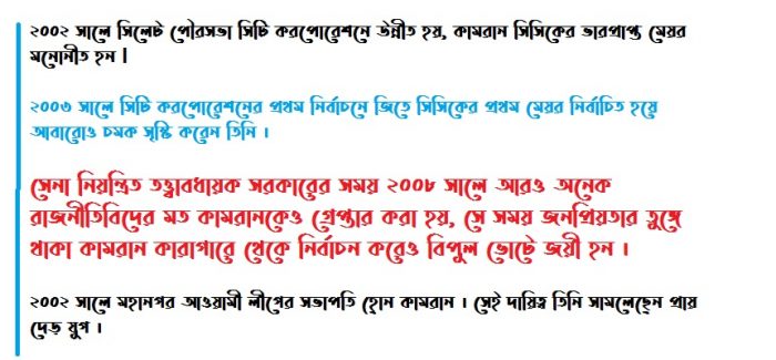 ২০০২ সালে সিলেট পৌরসভা সিটি করপোরেশনে উন্নীত হয়, কামরান সিসিকের ভারপ্রাপ্ত মেয়র মনোনীত হন । ২০০৩ সালে সিটি করপোরেশনের প্রথম নির্বাচনে জিতে সিসিকের প্রথম মেয়র নির্বাচিত হয়ে আবারোও চমক সৃষ্টি করেন তিনি । সেনা নিয়ন্ত্রিত তত্ত্বাবধায়ক সরকারের সময় ২০০৮ সালে আরও অনেক রাজনীতিবিদের মত কামরানকেও গ্রেপ্তার করা হয়, সে সময় জনপ্রিয়তার তুঙ্গে থাকা কামরান কারাগারে থেকে নির্বাচন করেও বিপুল ভোটে জয়ী হন । ২০০২ সালে মহানগর আওয়ামী লীগের সভাপতি হোন কামরান । সেই দায়িত্ব তিনি সামলেছেন প্রায় দেড় যুগ । ২০১৬ সালে আওয়ামী লীগের সম্মেলনে কেন্দ্রীয় কার্যনির্বাহী কমিটির সদস্য পদ পাওয়া কামরান বর্তমান কমিটিতেও একই পদে ছিলেন । ব্যক্তিগত জীবনে খুবই সাদামাটা চলাফেরায় অভ্যস্ত ছিলেন, আমি অনেক ঘটনার চাক্ষুষ সাক্ষী ।