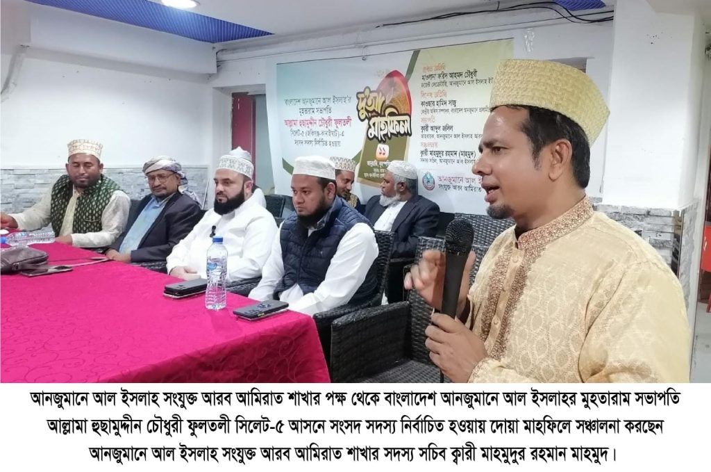 দ্বাদশ জাতীয় সংসদ নির্বাচনে সিলেট -৫ আসনে বাংলাদেশ আনজুমানে আল ইসলাহ’র মুহতারাম সভাপতি মাওলানা মোহাম্মদ হুছামুদ্দীন চৌধুরী ফুলতলী সংসদ সদস্য নির্বাচিত হওয়ায় আনজুমানে আল ইসলাহ সংযুক্ত আরব আমিরাতের পক্ষ থেকে দুআ মাহফিল অনুষ্ঠিত হয়।