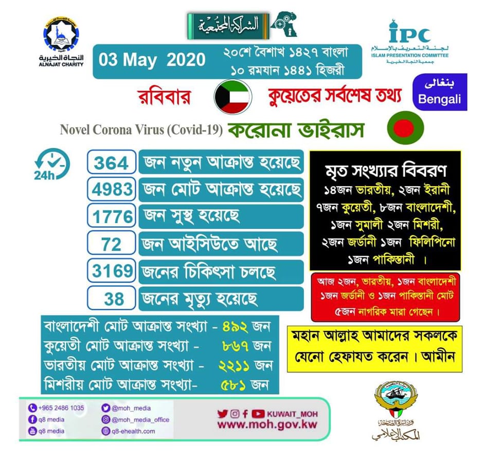 কুয়েতের স্বাস্থ্য মন্ত্রণালয়ের মুখপাত্র ড. আব্দুল্লাহ আল-সানাদ নিয়মিত ব্রিফিংয়ে তথ্য মতে- রবিবার ৩ মে স্থানীয় ইংরেজি দৈনিক পত্রিকা আরব টাইমস এক সংস্করণে তথ্য টি নিশ্চিত করে। কুয়েতে গত ২৪ ঘন্টায় নতুন করে করোনা আক্রান্ত সংখ্যা ৩৭জন বাংলাদেশী, ১২২ জন ইন্ডিয়ান, ৭৫জন মিসরীয়, ৯জন ফিলিপিনো, ৯জন সিরিয়ান, ৮জন পাকিস্তানী, বেদুন ও নেপালী ৬করে মোট ১২জন। তুরস্ব ৫জন, শ্রীলঙ্কান ৪জন। সৌদীয়ান ও ফিলিস্তীন ৬জন, ইটালী ২জন। অন্যান্য ৬জন,এবং কুয়েতি নাগরিক মোট ৬৯জন। সবমিলে ৩৬৪ জনকে শনাক্ত করা হয়েছে।