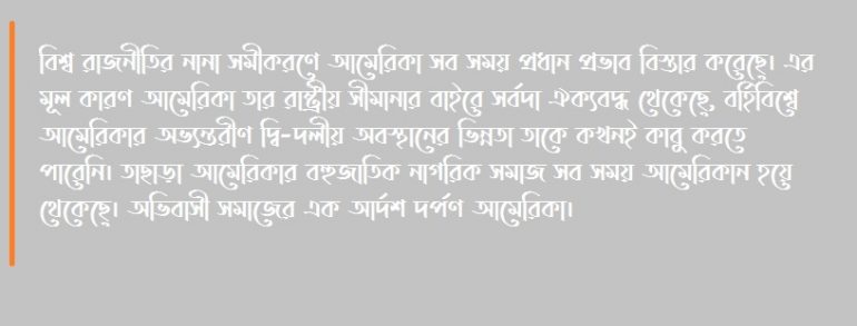 বিশ্ব রাজনীতির নানা সমীকরণে আমেরিকা সব সময় প্রধান প্রভাব বিস্তার করেছে। এর মূল কারণ আমেরিকা তার রাষ্ট্রীয় সীমানার বাইরে সর্বদা ঐক্যবদ্ধ থেকেছে, বর্হিবিশ্বে আমেরিকার অভ্যন্তরীণ দ্বি-দলীয় অবস্থানের ভিন্নতা তাকে কখনই কাবু করতে পারেনি। তাছাড়া আমেরিকার বহুজাতিক নাগরিক সমাজ সব সময় আমেরিকান হয়ে থেকেছে। অভিবাসী সমাজের এক আর্দশ দর্পণ আমেরিকা।